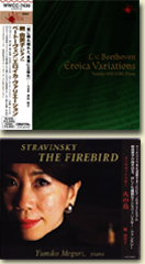 現在、桐朋学園大学の准教授として後進の指導に当たりながら活発な演奏活動を展開中の廻由美子。バロックから古典派・ロマン派、近現代にいたる十数枚のCDをリリース、いずれも高い評価を得ています。1984年センセーショナルなデビューを飾り、その後はベルギーやハンガリー、韓国にも招かれ成功を納めました。国内におけるリサイタルは「音楽の友」年間ベストテンに何度も選ばれるなどのかなりの実力者です。「ムジカノーヴァ」o7年11.12月号の2回に渡って“青柳いづみこの我が偏愛のピアニスト”にお二人の対談が紹介されていました。それによると、7作目のこのベートーヴェン以降の録音から、「バスが豊かで音のひろがりが素晴らしい」との思いからベーゼンドルファーを使っているそうです。「何かの機会にインペリアルを久しぶりに弾いたら『好きだな』って思った。海みたいな感じがあったのと、パノラマがぱっとこう開ける感じ・・」とも。同じベーゼンドルファーで(【水の音楽~オンディーヌとメリザンド:キング】=これがまたイイ!)を出されている青柳さんは「スピーディでキレの良い廻さんのピアノにある種のゆとりがうまれるようになったのは、ベーゼンドルファーを使い始めたからか。」と印象を語っています。「エロイカ・ヴァリエーション」はニクイ程上手にベースを使ってとても重厚感があって交響曲を彷彿させる秀作です。ピアノソナタ第14番「月光」も収められたこの作品もまたレコード芸術誌特選盤を受賞しています。
