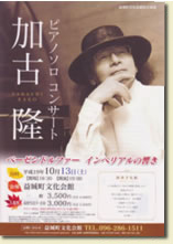 ♪感動のアンコール熊本公演 平成19年10月13日(土)益城町文化会館の自主事業として開催されました「加古隆ピアノ・ソロコンサート」~ベーゼンドルファーインペリアルの響き~は加古氏の感動的な演奏で終了致しました。「ピアノの画家」と称される加古隆氏が3年ぶりに益城町文化会館のステージへ姿を見せました。 お馴染の帽子と山本寛斎デザインのコスチューム。極力余計な演出効果を排したステージは、単に心地良いと言うより、ストーリー性溢れるドラマティックな演奏ばかりで、徐々に観客を惹き込んでしまいます。「とても感動しました。ご案内いただいて本当にありがとうございました。」「私がもし今日この席に居なかったら大きな損をしていたと思います。」等、今回の公演を多くの方にご案内した私は、たくさんの方々から感謝のお言葉をいただきました。9月6日の金閣寺、音舞台の出演や各地でのコンサート続きで、ハードスケジュールの中での熊本公演でしたが、疲れも見せない加古氏の素晴らしい演奏は私たちを魅了して終了致しました。 |
