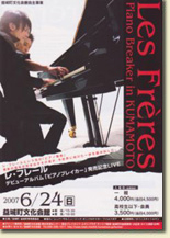 ♪レ・フレールの熊本公演「Piano Breaker in KUMAMOTO」は去る去る平成19年6月24日、熊本県の益城町文化会館の自主事業として開催されました兄弟ピアノデュオ「Les・Freres/レ・フレール」の熊本公演は大盛況のうちに終了致しました。