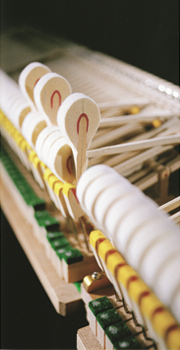 ピアノの微妙な音色の違いを司っている最も重要なパーツがこのハンマーフェルトの材質なのです。ハンマーフェルトは羊毛で出来ており、その羊毛の配合の違いや硬度、密度によって音色や幅が変わってきます。